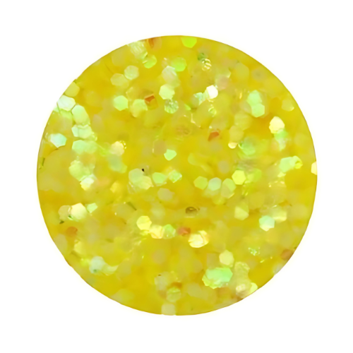 Brighten up your nail art with this vibrant sunny yellow Cosmetic Grade, Nail Art Glitter, featuring large hexagonal pieces with iridescent and holographic qualities that reflect light in subtle hues.