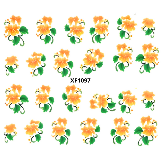 Brighten up your nail game with our Nail Art Water Transfer Decals, showcasing beautiful clusters of flowers resembling Coneflowers, with vibrant orange-yellow petals and lush green leaves.